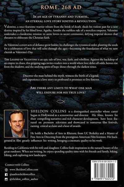 Sheldon Collins is an award-winning storyteller whose career began in Hollywood as a screenwriter and director. His films, celebrated for their compelling narratives and rich character development, have appeared on premium television and at major film festivals, earning critical acclaim and multiple awards.Collins brings his cinematic sensibility to the page with his debut novel, The Legend of Valentine, which reimagines the life and legacy of Saint Valentine. Blending epic historical drama with timeless themes of love, faith, and sacrifice, the book offers readers a sweeping tale set in third-century Rome. He also co-directed the immersive multi-cast audiobook adaptation, which features a full soundscape and an original score by a Grammy-nominated composer.A graduate of UC Berkeley (B.A. in Rhetoric) and the American Film Institute (M.F.A. in Directing), Collins combines a deep understanding of language with the visual precision of a filmmaker. He lives in California with his wife and daughter, and continues to craft stories that connect history's great struggles with the enduring power of love and faith.