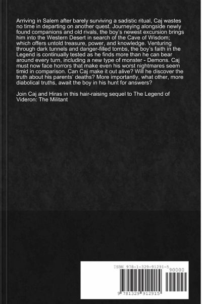 Arriving in Salem after barely surviving a sadistic ritual, Caj wastes no time in departing on another quest. Journeying alongside newly found companions and old rivals, the boy's newest excursion brings him into the Western Desert in search of the Cave of Wisdom; which offers untold treasure, power, and knowledge. Venturing through dark tunnels and danger-filled tombs, the boy's faith in the Legend is continually tested as he finds more than he can bear around every turn, including a new type of monster - Demons. Caj must now face horrors that make even his worst nightmares seem timid in comparison. Can Caj make it out alive? Will he discover the truth about his parents' deaths? More importantly, what other, more diabolical truths, await the boy in his hunt for answers? Join Caj and Hiras in this hair-raising sequel to The Legend of Videron: The Militant