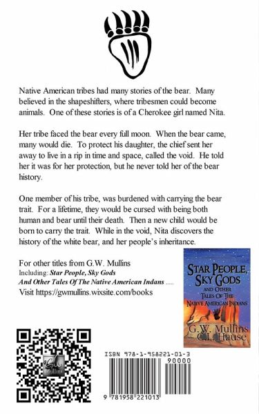 Native American tribes had many stories of the bear. Many believed in the shapeshifters, where tribesmen could become animals. One of these stories is of a Cherokee girl named Nita. Her tribe faced the bear every full moon. When the bear came, many would die. To protect his daughter, the chief sent her away to live in a rip in time and space, called the void. He told her it was for her protection, but he never told her of the bear history. One member of his tribe, was burdened with carrying the bear trait. For a lifetime, they would be cursed with being both human and bear until their death. Then a new child would be born to carry the trait. While in the void, Nita discovers the history of the white bear, and her people's inheritance.