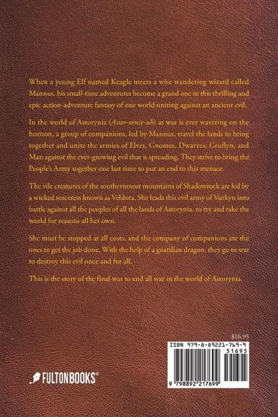 The Legends of Astorynia When a young Elf named Keagle meets a wise wandering wizard called Mannus, his small-time adventures become a grand one in this thrilling and epic action-adventure fantasy of one world uniting against an ancient evil. In the world of Astorynia (Astor-eenie-uh) as war is ever wavering on the horizon, a group of companions, led by Mannus, travel the lands to bring together and unite the armies of Elves, Gnomes, Dwarves, Gruflyn, and Man against the ever-growing evil that is spreading. They strive to bring the People's Army together one last time to put an end to this menace. The vile creatures of the southernmost mountains of Shadowrock are led by a wicked sorceress known as Veldora. She leads this evil army of Vurkyn into battle against all the peoples of all the lands of Astorynia, to try and take the world for reasons all her own. She must be stopped at all costs, and the company of companions are the ones to get the job done. With the help of a guardian dragon, they go to war to destroy this evil once and for all. This is the story of the final war to end all war in the world of Astorynia. 2