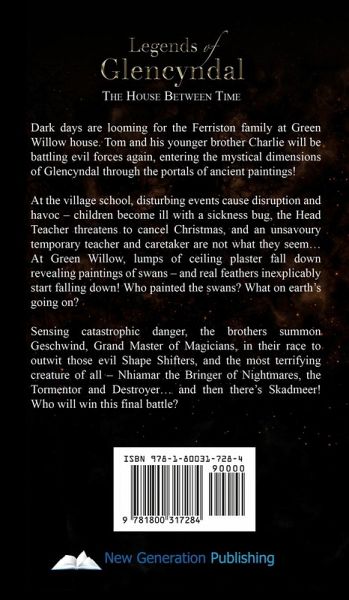 Dark days are looming for the Ferriston family at Green Willow house. Tom and his younger brother Charlie will be battling evil forces again, entering the mystical dimensions of Glencyndal through the portals of ancient paintings! At the village school, disturbing events cause disruption and havoc - children become ill with a sickness bug, the Head Teacher threatens to cancel Christmas, and an unsavoury temporary teacher and caretaker are not what they seem... At Green Willow, lumps of ceiling plaster fall down revealing paintings of swans - and real feathers inexplicably start falling down! Who painted the swans? What on earth's going on? Sensing catastrophic danger, the brothers summon Geschwind, Grand Master of Magicians, in their race to outwit those evil Shape Shifters, and the most terrifying creature of all - Nhiamar the Bringer of Nightmares, the Tormentor and Destroyer... and then there's Skadmeer! Who will win this final battle?