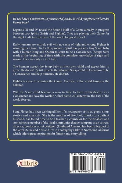 Legends III and IV pick up where Legends I and II left off. They reveal the second half of a game already in progress between two spirits (Spirit and Fighter). They are playing the game for the right to dictate the fate of the world for good or evil. Early humans are entirely evil with no sense of right and wrong. Fighter is winning the game. To fix this problem, Spirit has placed a tiny Scrap baby with a human King and Queen. Scraps were made at the beginning of time with the knowledge of right and wrong, but they are tiny (three inches-full grown!). The humans accept the Scrap baby as their own and expect him to grow. He doesn't. Spirit expects the adopted child to learn how to be a Conscience and help humans. Unfortunately, nobody tells the Scrap child about this. He feels that he is a useless runt. Fighter is close to winning the game. The fate of the world hangs in the balance. Will the Scrap child become a man in time to learn about his destiny and save his adopted father and the world? A final battle will determine the fate of the world forever.