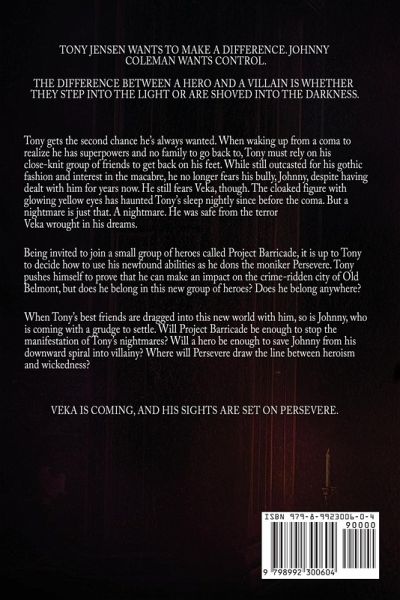 Tony Jensen wants to make a difference. Johnny Coleman wants control. The difference between a hero and a villain is whether they step into the light or are shoved into the darkness. Tony gets the second chance he's always wanted. When waking up from a coma to realize he has superpowers and no family to go back to, Tony must rely on his close-knit group of friends to get back on his feet. While still outcasted for his gothic fashion and interest in the macabre, he no longer fears his bully, Johnny, despite having dealt with him for years now. He still fears Veka, though. The cloaked figure with glowing yellow eyes has haunted Tony's sleep nightly since before the coma. But a nightmare is just that. A nightmare. He was safe from the terror Veka wrought in his dreams. Being invited to join a small group of heroes called Project Barricade, it is up to Tony to decide how to use his newfound abilities as he dons the moniker Persevere. Tony pushes himself to prove that he can make an impact on the crime-ridden city of Old Belmont, but does he belong in this new group of heroes? Does he belong anywhere? When Tony's best friends are dragged into this new world with him, so is Johnny, who is coming with a grudge to settle. Will Project Barricade be enough to stop the manifestation of Tony's nightmares? Will a hero be enough to save Johnny from his downward spiral into villainy? Where will Persevere draw the line between heroism and wickedness? Veka is coming, and his sights are set on Persevere.