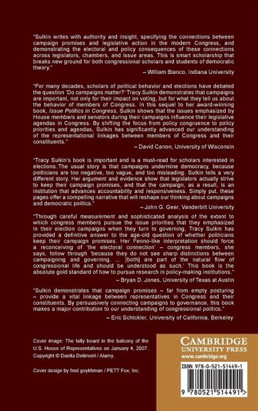 Tracy Sulkin is Associate Professor in the Department of Political Science at the University of Illinois, Urbana-Champaign. She is the author of Issue Politics in Congress, which won the American Political Science Association's Fenno Prize for the best book in legislative studies. Her work has appeared in leading journals such as the American Political Science Review, the Journal of Politics and Legislative Studies Quarterly.