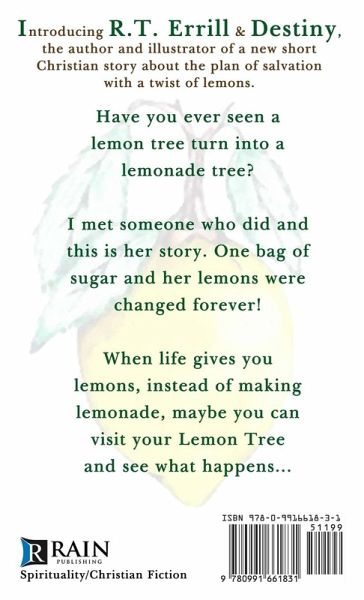 Introducing RT Errill & Destiny, the author and illustrator of a new short story Christian book about the plan of salvation with a twist of lemons. Have you ever seen a lemon tree turn into a lemonade tree? I met someone who did and this is their story. One bag of sugar and her lemons were changed forever! So when life gives you lemons, instead of making lemonade, maybe you can visit your Lemon Tree and see what happens...
