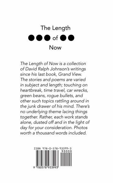 The Length of Now is a collection of David Ralph Johnson's writings since his last book, Grand View. The stories and poems are varied in subject and length; touching on heartbreak, time travel, car wrecks, green beans, rogue bullets, and other such topics rattling around in the junk drawer of his mind. There's no underlying theme lacing things together. Rather, each work stands alone, dusted off and in the light of day for your consideration. Photos worth a thousand words included.