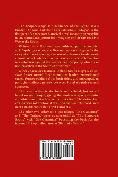 The Leopard's Spots: A Romance of the White Man's Burden, Volume I of the "Reconstruction Trilogy," is the first part of a three part historical novel meant to portray life in the immediate period following the end of the US Civil War in the South. Written by a Southern sympathizer, political activist and Baptist preacher, the Reconstruction trilogy tells the story of Charles Gaston, the son of a famous Confederate colonel, who leads his men from the state of North Carolina in a rebellion against the Reconstruction policy which was implemented in the South after the war. Other characters featured include Simon Legree, an ex-slave driver turned Reconstruction leader, emancipated slaves, former soldiers from both sides, and unscrupulous politicians, all set against a love story based around the main character. The personalities in the book are fictional, but are all based on real people, giving the work a uniquely realistic air, which made it a best seller in its time. The entire first edition was sold before it was printed, and the book sold over 100,000 copies in its first 6 months. The other two volumes in this trilogy, "The Clansman" and "The Traitor," were as successful as "The Leopard's Spots," with "The Clansman" becoming the basis for the famous 1915 epic silent movie "Birth of a Nation."