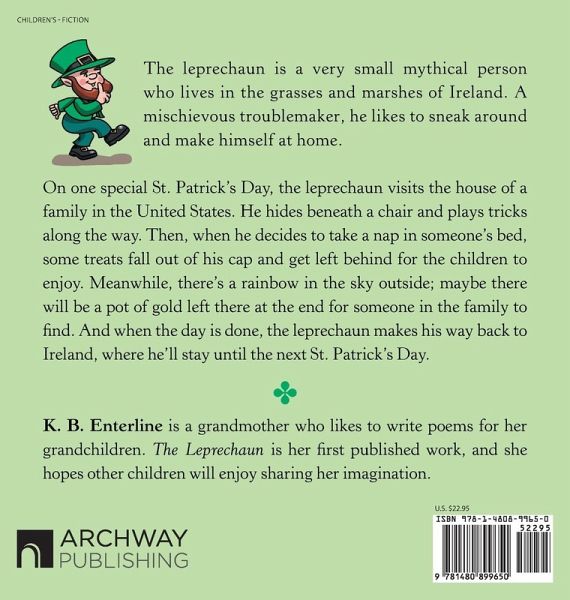 The leprechaun is a very small mythical person who lives in the grasses and marshes of Ireland. A mischievous troublemaker, he likes to sneak around and make himself at home. On one special St. Patrick's Day, the leprechaun visits the house of a family in the United States. He hides beneath a chair and plays tricks along the way. Then, when he decides to take a nap in someone's bed, some treats fall out of his cap and get left behind for the children to enjoy. Meanwhile, there's a rainbow in the sky outside; maybe there will be a pot of gold left there at the end for someone in the family to find. And when the day is done, the leprechaun makes his way back to Ireland, where he'll stay until the next St. Patrick's Day.