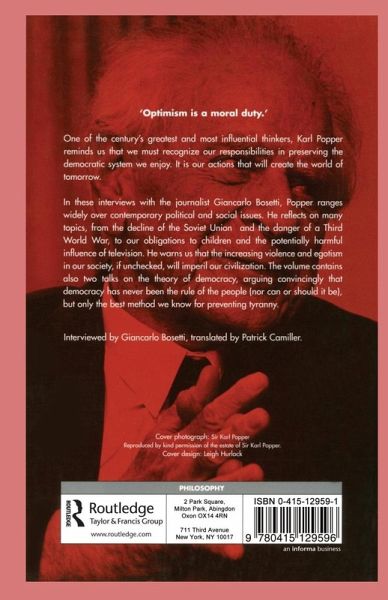 One of the century's greatest and most influential thinkers, Karl Popper reminds us that we must recognize our responsibilities in preserving the democratic system we enjoy: it is our actions which will create the world of tomorrow. In these interviews with journalist Giancarlo Bosetti, Karl Popper ranges widely over contemporary political and social issues. He reflects on many topics, from the decline of the Soviet Union and the danger of a Third World War, to our obligations to children and the potentially harmful influence of television. He warns us that the increasing violence and egotism of our society, if unchecked, will imperil our civilisation. The volume also contains two talks on the theory of democracy, arguing that democracy has never been the rule of the people (nor can or should it be), but only the best method we know for preventing tyranny.