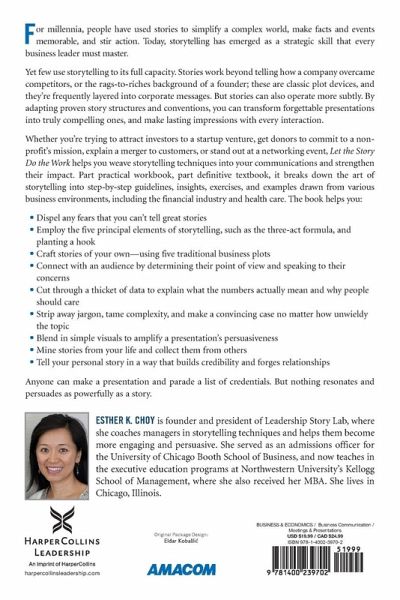 People forget facts, but they never forget a good story. Let the Story Do the Work shows how the art of storytelling is key for any business to achieve success. For most, there's nothing easy about crafting a memorable story, let alone linking it to professional goals. However, material for stories and anecdotes that can be used for your professional success already surround you. To get people interested in and convinced by what you are saying, you need to tell an interesting story. As the Founder and Chief Story Facilitator at Leadership Story Lab, a company that helps executives unlock the persuasive power of storytelling, Esther Choy teaches you how to mine your experience for simple narratives that will achieve your goals. In Let the Story Do the Work, you can learn to: Capture attention Engage your audience Change minds Inspire action Pitch persuasively When you find the perfect hook, structure your story according to its strengths, and deliver it at the right time in the right way, you'll see firsthand how easy it is to turn everyday communications into opportunities to connect, gain buy-in, and build lasting relationships.