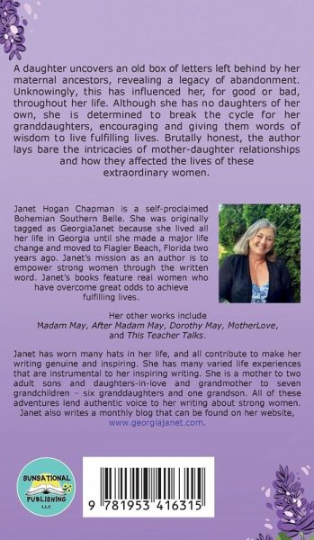 A daughter uncovers an old box of letters left behind by her maternal ancestors, revealing a legacy of abandonment. Unknowingly, this has influenced her, for good or bad, throughout her life. Although she has no daughters of her own, she is determined to break the cycle for her granddaughters, encouraging and giving them words of wisdom to live fulfilling lives. Brutally honest, the author lays bare the intricacies of mother-daughter relationships and how they affected the lives of these extraordinary women.