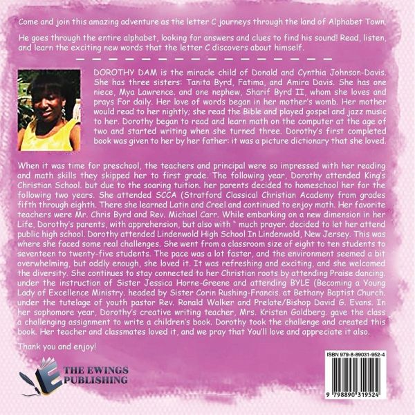 Come and join this amazing adventure as the letter C journeys through the land of Alphabet Town. He goes through the entire alphabet. looking for answers and clues to find his sound! Read, listen, and learn the exciting new words that the letter C discovers about himself.