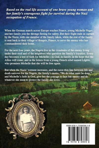 When the German march across Europe reaches France, young Michelle Naget and her family join the throngs fleeing for safety. But their flight ends in capture by the Nazis, with one member of the family taken, while the rest of the family is sent back to their village of Braquis, France, to serve the enemy who has commandeered their home. For the next four years, the Nagets live in the crosshairs of the enemy living under their roof and of the neighbors who question the family's loyalties. Every day becomes a test of faith for Michelle-in God, in family, in the hope that the Allies will come, and in the letters from a young French rebel named Légère who promises Michelle that she will be free again. But when the Nazis' torment increases, and the razor-thin line between life and death narrows for the Nagets, the family's motto, "We do what must be done," and Michelle's faith in God, give her the courage to face her enemy and do whatever she must to protect the family she loves.