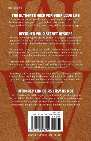 If you've ever suspected that not everyone wants the same things from relationships, you're right. In fact, what we need to feel loved, supported, and fulfilled differs according to four personality types. Are you fiercely independent and driven to achieve a significant life purpose? Do you feel proudest when you're with an accomplished partner? You may be encoded with the motivations of a letter H. Do you love taking care of the people you love and contributing to their happiness? Do you feel secure when your partner is also giving back? You may be encoded with the motivations of a letter A. Are you a natural team player? Do you feel confident because you know your partner is your best friend and has your back? You may be encoded with the motivations of a letter Y. Does your soul soar with ecstasy when you're challenged to grow? Are you always reaching for the next level in your life and want your partner to ground you and help you evolve? You may be encoded with the motivations of a letter W. This remarkable breakthrough system devised by psychologist Dr. Krystal White, The Letter Code, offers you an individualized roadmap to reduce conflict, improve communication, and enhance your connectivity and pleasure in your most fundamental relationship.