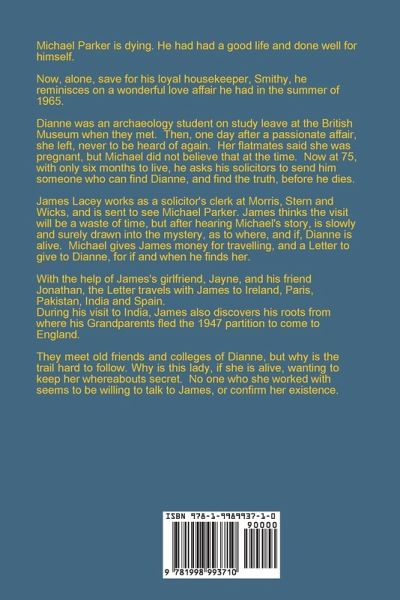 A Passionate Affair, Lost Love, Family Intrigue, a Suspicious Death Michael Parker is dying. He has had a good life and done well for himself. Now, alone, save for his loyal housekeeper, Smithy, he reminisces on a wonderful love affair he had in the summer of 1965. Dianne was an archaeology student on study leave at the British Museum when they met. Then, one day after a passionate affair, she left, never to be heard of again. Her flatmates said she was pregnant, but Michael did not believe that at the time. Now at 75, with only six months to live, he asks his solicitors to send him someone who can find Dianne, and find the truth, before he dies. James Lacey works as a solicitor's clerk at Morris, Stern and Wicks, and is sent to see Michael Parker. James thinks the visit will be a waste of time, but after hearing Michael's story, is slowly and surely drawn into the mystery, as to where, and if, Dianne is alive. Michael gives James money for travelling, and a Letter to give to Dianne, for if and when he finds her. With the help of James's girlfriend, Jane, and his friend Jonathan, the Letter travels with James to Ireland, Paris, Pakistan, India and Spain. They meet old friends and colleges of Dianne, but why is the trail hard to follow. Why is this lady, if she is alive, wanting to keep her whereabouts secret. No one whom she worked with seems to be willing to talk to James, or confirm her existence. James travels far and wide to unravel the mystery that is Dianne Holland, but also discovers secrets about his own relatives on a visit to India. ¿Can James Lacey juggle all of these events as well as coming to terms with his own personal anxieties?