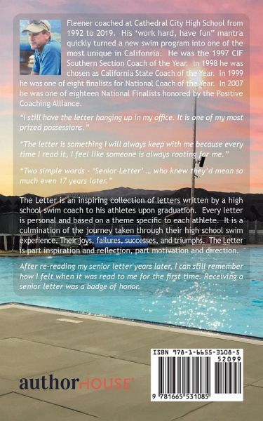 The Letter is an inspiring collection of letters written by a high school swim coach to his athletes upon graduation. Every letter is personal and based on a theme specific to each athlete. It is a culmination of the journey taken through their high school swim experience. Their joys, failures, successes, and triumphs. The Letter is part inspiration and reflection, part motivation and direction.