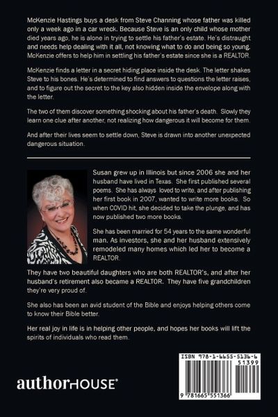 McKenzie Hastings buys a desk from Steve Channing whose father was killed only a week ago in a car wreck. Because Steve is an only child whose mother died years ago, he is alone in trying to settle his father's estate. He's distraught and needs help dealing with it all, not knowing what to do and being so young. McKenzie offers to help him in settling his father's estate since she is a REALTOR. McKenzie finds a letter in a secret hiding place inside the desk. The letter shakes Steve to his bones. He's determined to find answers to questions the letter raises, and to figure out the secret to…mehr
