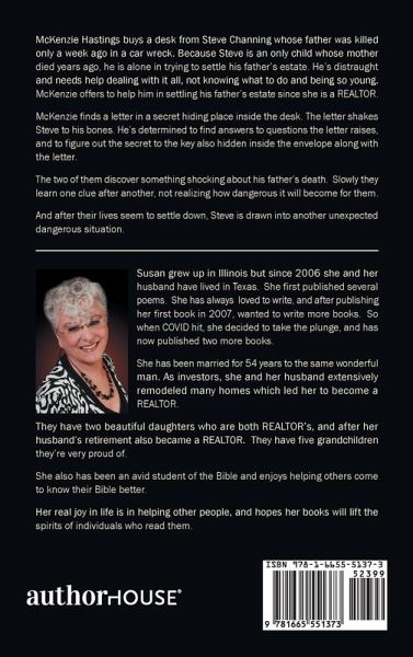 McKenzie Hastings buys a desk from Steve Channing whose father was killed only a week ago in a car wreck. Because Steve is an only child whose mother died years ago, he is alone in trying to settle his father's estate. He's distraught and needs help dealing with it all, not knowing what to do and being so young. McKenzie offers to help him in settling his father's estate since she is a REALTOR. McKenzie finds a letter in a secret hiding place inside the desk. The letter shakes Steve to his bones. He's determined to find answers to questions the letter raises, and to figure out the secret to the key also hidden inside the envelope along with the letter. The two of them discover something shocking about his father's death. Slowly they learn one clue after another, not realizing how dangerous it will become for them. And after their lives seem to settle down, Steve is drawn into another unexpected dangerous situation.