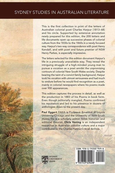 This is the first collection in print of the letters of Australian colonial poet Charles Harpur (1813-68) and his circle. Supported by extensive annotation newly prepared for this edition, the 200 letters and life-documents open up successive phases of colonial culture from the 1830s to the 1860s in a newly focused way. Harpur's two-way correspondence with poet Henry Kendall, and with poet and future premier of NSW Henry Parkes, is especially impressive. The letters selected for this edition document Harpur's life in a previously unavailable way. They reveal the intriguing struggle of a high-minded young man to pursue a serious vocation as a poet amidst the unpromising contours of colonial New South Wales society. Despite bearing the taint of a convict family background, Harpur took his vocation with utmost seriousness and had much to endure before he would find recognition as a poet, mainly in colonial newspapers where his poems made over 900 appearances. This edition captures the process in detail, as well as the production in 1883 of his Poems in book form. Even though editorially mangled, Poems confirmed his reputation and led to his presence in dozens of anthologies down to the present day. "Immensely valuable to those interested in Australia's colonial poetry and the conditions of its making." "This edition is fascinating reading. Letters by Harpur's correspondents as well as by the man himself offer insights into mid-nineteenth century Australian society and colonial print culture, as well as the character and sensibility of Harpur the poet. The editors provide ample explanatory annotation and well chosen illustrations to animate their subject." "The introduction is bound to become fundamental to all future biographies of the poet, while the exhaustive editorial critical apparatus offers a paradigm for the future publication of writers' letters." "A masterclass in new documentary editing." "Charles Harpur occupies a similar position in Australian literary history to Walt Whitman in America: not only the country's first major poet, but one attempting self-consciously to correlate national mythologies with wider cultural styles and traditions. Harpur's extensive prose commentaries on his own poetry, too often overlooked, testify to his intellectual ambition, and this long overdue collection of his letters significantly expands our understanding of his work. Paul Eggert and Chris Vening's exemplary scholarly edition performs a signal service for studies not only of Australian literature but nineteenth-century poetry in general."