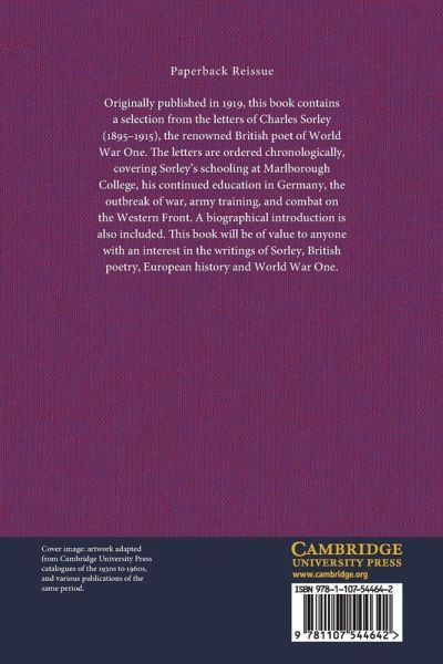 Originally published in 1919, this book contains a selection from the letters of Charles Sorley (1895-1915), the renowned British poet of World War One. The letters are ordered chronologically, covering Sorley's schooling at Marlborough College, his continued education in Germany, the outbreak of war, army training, and combat on the Western Front. A biographical introduction is also included. This book will be of value to anyone with an interest in the writings of Sorley, British poetry, European history and World War One.