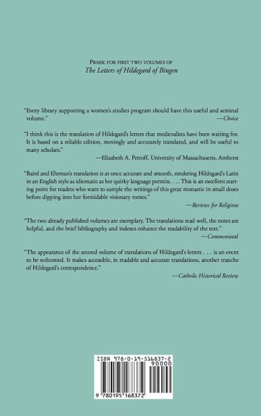 This is the third and final volume of the complete annotated correspondence of the extraordinary nun, Hildegard of Bingen (1098-1179). One of the most remarkable women of her day, Hildegard was, for more than 30 years, an unflinching advisor and correspondent of all levels of church and society, from popes and kings to ordinary lay persons, from Jerusalem to England. This present volume (letters 218-390) is noteworthy for its large collection of letters to a non-ecclesiastical audience, and because it contains letters not just to such high-ranking notables as Frederick Barbarossa, King Henry II of England, or Eleanor or Acquitaine, but also to common, ordinary individuals of no importance whatsoever, save that they received a letter from Hildegard of Bingen. Addressing matters as diverse as the "humors" and their relation to health and salvation, the fate of departed souls, the frequency and horror of homicide in her age, a means of exorcising malignant spirits, an effective kind of incantation to alleviate nightmares, the proper attitude and response to the fact of excommunication, and male infidelity in marriage, Hildegard provides a unique view of the twelfth century world. Here also are found compositions in epistolary style that are actually sermons, mediations, prayers, or treatises on a wide range of theological topics, such as prophecy, celebration of the Mass, the Lord's Prayer, the creation, and the fall of Adam. Like previous volumes, the translation follows the most recent definitive Latin text, in which the letters are organized according to the rank and station of Hildegard's correspondents.
