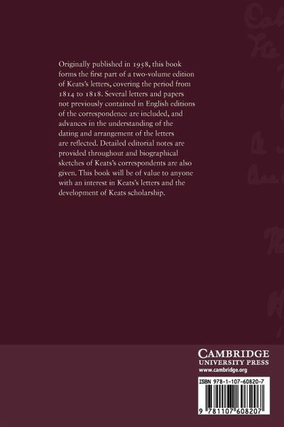 Originally published in 1958, this book forms the first part of a two-volume edition of Keats's letters, covering the period from 1814 to 1818. Several letters and papers not previously contained in English editions of the correspondence are included, and advances in the understanding of the dating and arrangement of the letters are reflected. Detailed editorial notes are provided throughout and biographical sketches of Keats's correspondents are also given. This book will be of value to anyone with an interest in Keats's letters and the development of Keats scholarship.