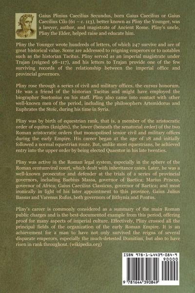 Gaius Plinius Caecilius Secundus, born Gaius Caecilius or Gaius Caecilius Cilo (61 – c. 113), better known as Pliny the Younger, was a lawyer, author, and magistrate of Ancient Rome. Pliny's uncle, Pliny the Elder, helped raise and educate him. Pliny the Younger wrote hundreds of letters, of which 247 survive and are of great historical value. Some are addressed to reigning emperors or to notables such as the historian Tacitus. Pliny served as an imperial magistrate under Trajan (reigned 98–117), and his letters to Trajan provide one of the few surviving records of the relationship between the imperial office and provincial governors. Pliny rose through a series of civil and military offices, the cursus honorum. He was a friend of the historian Tacitus and might have employed the biographer Suetonius on his staff. Pliny also came into contact with other well-known men of the period, including the philosophers Artemidorus and Euphrates the Stoic, during his time in Syria. Pliny was by birth of equestrian rank, that is, a member of the aristocratic order of equites (knights), the lower (beneath the senatorial order) of the two Roman aristocratic orders that monopolised senior civil and military offices during the early Empire. His career began at the age of 18 and initially followed a normal equestrian route. But, unlike most equestrians, he achieved entry into the upper order by being elected Quaestor in his late twenties. Pliny was active in the Roman legal system, especially in the sphere of the Roman centumviral court, which dealt with inheritance cases. Later, he was a well-known prosecutor and defender at the trials of a series of provincial governors, including Baebius Massa, governor of Baetica; Marius Priscus, governor of Africa; Gaius Caecilius Classicus, governor of Baetica; and most ironically in light of his later appointment to this province, Gaius Julius Bassus and Varenus Rufus, both governors of Bithynia and Pontus. Pliny's career is commonly considered as a summary of the main Roman public charges and is the best-documented example from this period, offering proof for many aspects of imperial culture. Effectively, Pliny crossed all the principal fields of the organization of the early Roman Empire. It is an achievement for a man to have not only survived the reigns of several disparate emperors, especially the much-detested Domitian, but also to have risen in rank throughout. (wikipedia.org)
