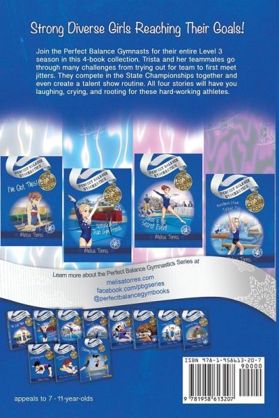 Meet Trista and her teammates; strong diverse girls reaching their goals! ***Four great stories in one BIG book!*** Join the Perfect Balance Gymnasts for their entire Level 3 season in this 4-book collection. Trista and her teammates go through many challenges from trying out for team to first meet jitters. They compete in the State Championships together and even create a talent show routine. All four stories will have you laughing, crying, and rooting for these hard-working athletes. Perfect Balance Gymnastics Books teach girls to be kind to each other, flexible in life, courageous, strong, and most of all, confident. The books set the reader in the world of gymnastics. The characters are relatable and have age-appropriate challenges. Each book explores a major life lesson that empowers girls to understand their own inner strengths. Perfect Balance Gymnastics Books increase reading level from 2nd grade to 6th grade as the series progresses. The Level 3 Collection is a 2nd/3rd to 3rd/4th grade reading level and appeals to 7-11 year-olds. The Stories in The Level 3 Collection include: I've Got This! Nothing Better Than Gym Friends Dance is the Secret Event Brothers Have Talent, Too ***All four stories are bound in one BIG book!***