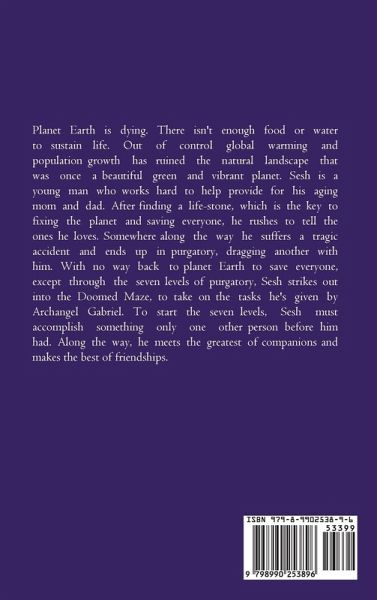 Planet Earth is dying. There isn't enough food or water to sustain life. Out of control global warming and population growth has ruined the natural landscape that was once a beautiful green and vibrant planet. Sesh is a young man who works hard to help provide for his aging mom and dad. After finding a life-stone, which is the key to fixing the planet and saving everyone, he rushes to tell the ones he loves. Somewhere along the way he suffers a tragic accident and ends up in purgatory, dragging another with him. With no way back to planet Earth to save everyone, except through the seven levels of purgatory, Sesh strikes out into the Doomed Maze, to take on the tasks he's given by Archangel Gabriel. To start the seven levels, Sesh must accomplish something only one other person before him had. Along the way, he meets the greatest of companions and makes the best of friendships.