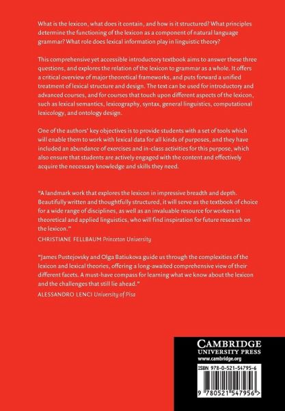 What is the lexicon, what does it contain, and how is it structured? What principles determine the functioning of the lexicon as a component of natural language grammar? What role does lexical information play in linguistic theory? This accessible introduction aims to answer these questions, and explores the relation of the lexicon to grammar as a whole. It includes a critical overview of major theoretical frameworks, and puts forward a unified treatment of lexical structure and design. The text can be used for introductory and advanced courses, and for courses that touch upon different aspects of the lexicon, such as lexical semantics, lexicography, syntax, general linguistics, computational lexicology and ontology design. The book provides students with a set of tools which will enable them to work with lexical data for all kinds of purposes, including an abundance of exercises and in-class activities designed to ensure that students are actively engaged with the content and effectively acquire the necessary knowledge and skills they need.