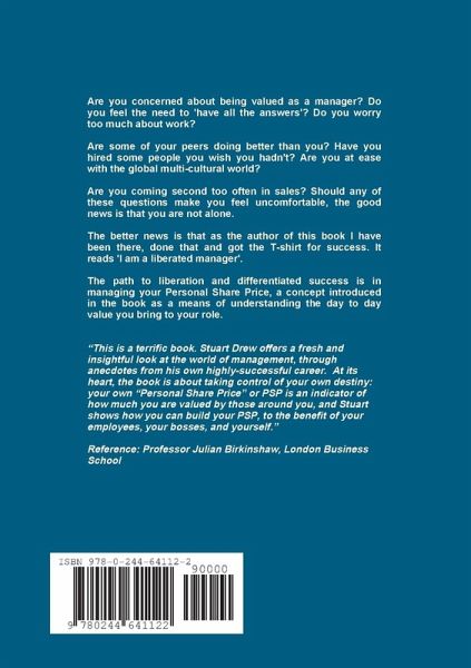 How are you valued as a manager? Do you feel the need to 'have all the answers'? Do you worry too much about work? Are some of your peers doing better than you? Are you at ease with the global multi-cultural world? Are you coming second too often in sales? Should any of these questions make you feel uncomfortable, you are not alone. The path to liberation and differentiated success is in managing your Personal Share Price, a concept introduced in this book. "This is a terrific book. Stuart Drew offers a fresh and insightful look at the world of management, through anecdotes from his own highly-successful career. Professor Julian Birkinshaw, London Business School "The Liberated Manager' is a must-read for all who need help in getting prepared to tackle the myriad challenges of managing people in today's agile world". Anand Pillai, Managing Director Leadership Matters Inc