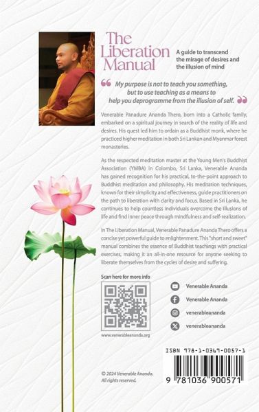 In The Liberation Manual, Venerable Panadure Ananda Thero-respected Buddhist monk and meditation master-guides readers on a profound journey towards spiritual freedom. This book distills the essence of Buddhist teachings, offering precise and structured meditation techniques that lead directly to liberation. With twelve powerful methods carefully crafted for both beginners and seasoned practitioners, each step of the path is clearly explained, guiding you through the complexities of life's unsatisfactory nature and the illusions of desires. The manual emphasizes the understanding of non-self (anatta), the impermanence of existence (anicca), and the ultimate truth that suffering is an inherent part of life (dukkha). This is not merely a theoretical guide; it is a practical, hands-on manual that walks you through every step of the way, from understanding the causes of suffering to attaining the ultimate goal: liberation from the cycle of rebirth and the realization of Nirvana. With profound wisdom drawn from ancient teachings and contemporary meditation practice, Venerable Ananda offers readers a path to true peace and contentment. The Liberation Manual is a must-read for those who seek the truth beyond worldly desires and wish to explore the depths of spiritual awakening, guided by an experienced master committed to helping others attain the highest realization.