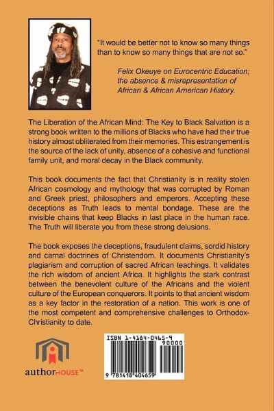 The Liberation of the African Mind: The Key to Black Salvation is both prophetic and revolutionary. It is prophetic in that it points to the direction the Black Church must take. It is revolutionary because it challenges the reader to establish a new religious paradigm; an African Spiritual frame of reference. This book documents the testimonies of the perpetrators. What the world has been given as Christianity, as original revelation from the Creator is in reality stolen African cosmology and myths that have been corrupted by Roman and Greek priest, philosophers and emperors. The Truth will liberate you from their strong delusions. While there are indeed some positive aspects to Church membership it is time for the Black Church to Exodus from the Western religious way of faith in God to the African spiritual way of knowledge of God. Rise Prodigal sons and daughters of Africa and of the Most High God. Rise and claim your real spiritual inheritance. It is time to manifest your godhood because the Black community will not be saved by mere mortals. It is time for us to put on immortality and live our divinity. The Liberation of the African Mind: The Key to Black Salvation makes the spiritual resurrection of the Black man a valid goal.