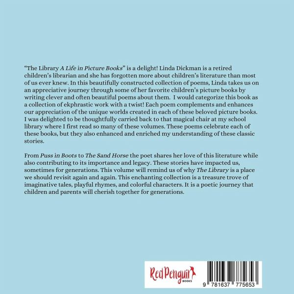 "The Library A Life in Picture Books" is a delight! Linda Dickman is a retired children's librarian and she has forgotten more about children's literature than most of us ever knew. In this beautifully constructed collection of poems, Linda takes us on an appreciative journey through some of her favorite children's picture books by writing clever and often beautiful poems about them. I would categorize this book as a collection of ekphrastic work with a twist! Each poem complements and enhances our appreciation of the unique worlds created in each of these beloved picture books. I was delighted to be thoughtfully carried back to that magical chair at my school library where I first read so many of these volumes. These poems celebrate each of these books, but they also enhanced and enriched my understanding of these classic stories. From Puss in Boots to The Sand Horse the poet shares her love of this literature while also contributing to its importance and legacy. These stories have impacted us, sometimes for generations. This volume will remind us of why The Library is a place we should revisit again and again. This enchanting collection is a treasure trove of imaginative tales, playful rhymes, and colorful characters. It is a poetic journey that children and parents will cherish together for generations.