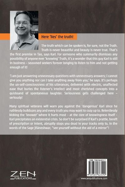 Here 'lies' the truth! The truth which can be spoken is, for sure, not the Truth. Truth is never beautiful and beauty is never true. That's the first premise in Tao, says Karl. For someone who summarily dismisses any possibility of anyone ever 'knowing' Truth, it's a wonder that this guy Karl is still in business - seasoned seekers forever longing to listen to him and not getting enough of it! 'I am just answering unnecessary questions with unnecessary answers; I cannot give you anything nor c