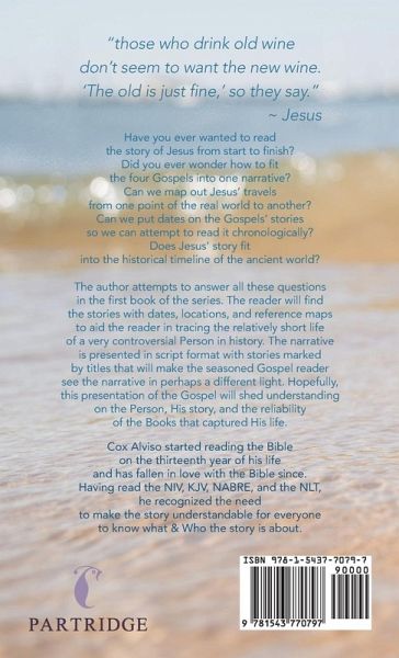 "those who drink old wine don't seem to want the new wine. 'The old is just fine,' so they say." ~ Jesus Have you ever wanted to read the story of Jesus from start to finish? Did you ever wonder how to fit the four Gospels into one narrative? Can we map out Jesus' travels from one point of the real world to another? Can we put dates on the Gospels' stories so we can attempt to read it chronologically? Does Jesus' story fit into the historical timeline of the ancient world? The author attempts to answer all these questions in the first book of the series. The reader will find the stories with dates, locations, and reference maps to aid the reader in tracing the relatively short life of a very controversial Person in history. The narrative is presented in script format with stories marked by titles that will make the seasoned Gospel reader see the narrative in perhaps a different light. Hopefully, this presentation of the Gospel will shed understanding on the Person, His story, and the reliability of the Books that captured His life.