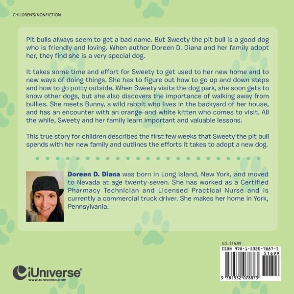 Pit bulls always seem to get a bad name. But Sweety the pit bull is a good dog who is friendly and loving. When author Doreen D. Diana and her family adopt her, they find she is a very special dog. It takes some time and effort for Sweety to get used to her new home and to new ways of doing things. She has to figure out how to go up and down steps and how to go potty outside. When Sweety visits the dog park, she soon gets to know other dogs, but she also discovers the importance of walking away from bullies. She meets Bunny, a wild rabbit who lives in the backyard of her house, and has an encounter with an orange-and-white kitten who comes to visit. All the while, Sweety and her family learn important and valuable lessons. This true story for children describes the first few weeks that Sweety the pit bull spends with her new family and outlines the efforts it takes to adopt a new dog.