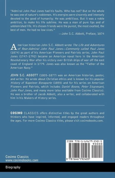 "Admiral John Paul Jones had his faults. Who has not? But on the whole he was one of nature's noblemen. His energies were sincerely and intensely devoted to the good of humanity; He was ambitious. But it was a noble ambition, to make his life sublime. He was a man of pure lips and of unblemished life. His chosen friends were the purest, the most exalted, the best of men. He had no low vices." -John S.C. Abbott, Preface, 1874 American historian John S.C. Abbott wrote The Life and Adventures of Rear-Admiral John Paul Jones-Commonly called Paul Jones (1874) as part of his American Pioneers and Patriots series. John Paul Jones (1747-1792) became an American naval hero in the American Revolutionary War after his victory over British ships of war off the east coast of England in 1779. Jones was also known as the "Father of the American Navy."