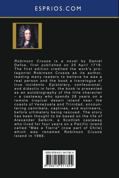 Robinson Crusoe is a novel by Daniel Defoe, first published on 25 April 1719. The first edition credited the work's protagonist Robinson Crusoe as its author, leading many readers to believe he was a real person and the book a travelogue of true incidents. Epistolary, confessional, and didactic in form, the book is presented as an autobiography of the title character - a castaway who spends 28 years on a remote tropical desert island near the coasts of Venezuela and Trinidad, encountering cannibals, captives, and mutineers, before ultimately being rescued. The story has been thought to be based on the life of Alexander Selkirk, a Scottish castaway who lived for four years on a Pacific island called "Más a Tierra" (now part of Chile) which was renamed Robinson Crusoe Island in 1966.