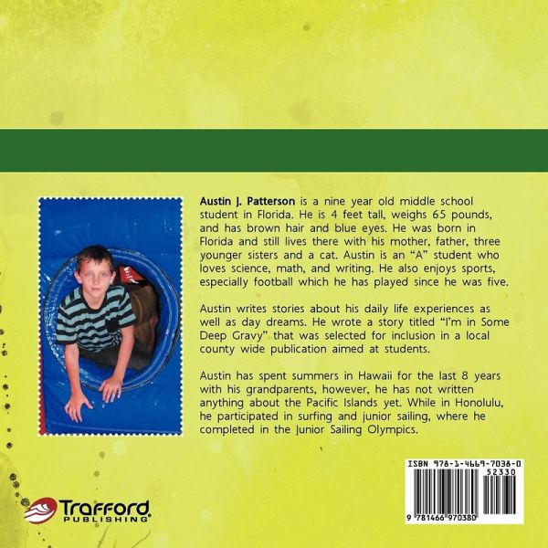 This book is a collection of short stories written by a nine-year-old about his daily life experiences and events as he sees them. The stories narrate events to kids from a kid's point of view. Many of the stories are true. Some of the stories are true with a little embellishment, and others are complete fiction. Read along as Austin shares his experience on a roller coaster that goes so fast it breaks loose and flies into outer space, or read about a team of junior explorers in their lava-proof suits as they descend into a volcano. Obviously, those stories are fiction, but Austin also relates everyday experiences like the day he went to the grocery store with his mom and three sisters, and one sister temporarily disappeared. Austin will communicate his passion for football, computers, ice cream, and writing. These are all stories dreamed, written, and shared by a kid to kids.