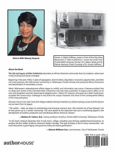The Life and Legacy of Allen Subdivision describes an African American community from its inception, where over ninety bustling African American-owned businesses emerged. Beginning in the early 1900s, in spite of segregation, discrimination, disparities in economic opportunities, and other Jim Crow practices, this little-known community in Tallahassee, Florida, thrived and produced African Americans and descendants of remarkable success. Through personal accounts of residents, oral history of neighborhood elders and official historical records, the author illuminates alluring messages about the value of this modest neighborhood in the American landscape. Inspired by 2008 city and county plans for urban redevelopment, including commemorative markers in the south central section of Tallahassee, this work is rare. With the launching of the civic project, it became evident that no deep-dive review of the cherished 'Allen' neighborhood had ever been published or made available to policy makers and civic planners. The untold, rich legacy of the once significantly independent community and its effect on its sons and daughters and their descendants required action. Deloris M. Harpool, who grew up in the humble neighborhood, accepted the challenge to document the unique character and consequential effects of her treasured home place. The book is enriched with a fascinating blend of humorous and yet sobering reported experiences reminiscent of life in 'Allen.' It presents early developers and environmental conditions, superstitions, myths and traditions that existed as a part of the neighborhood experience. It reveals medical home remedies, home-grown foods, 'make do' meals, meatless sandwiches, make-shift toys and games, favorite sweet treats, jokes, nicknames, coping strategies, fun experiences, and other aspects of life common to many individuals raised in African American communities. This rendering emphasizes the significance of the role of neighborhood churches, Black-owned businesses and an informal, yet integral relationship with Florida A&M University. It describes loyalty and loving relations among residents, collective discipline and protection of children, and sage advice of the elders in meeting social and economic challenges. It further describes the community's little-known involvement in the civil rights movement and the achievement of 'Allen' residents. As a bonus, this depiction offers a roadmap for acceptance of ethic experiences and contributions in civic planning. Discover how an iron-clad, close-knit village enabled individual members to achieve lasting success and the lessons we can learn from its legacy and social determinants of success. "The author... takes me down an entertaining and amusing memory lane...She reminds me of how blessed I am to have grown up in a similar community. This work speaks to the important role such a community played in the development of resilient, productive and contributing African American citizens." -Barbara R. Cotton, D.A., history professor emeritus, Florida A&M University, Tallahassee, Florida "In this book, Harpool illustrates that it truly took a village, including once thriving neighborhood businesses, to produce the fine caliber of African American leaders of today. This type of history is lost in many communities. Her work documents a great legacy and preserves history for future generations." -Dianne Williams-Cox, commissioner, City of Tallahassee, Florida