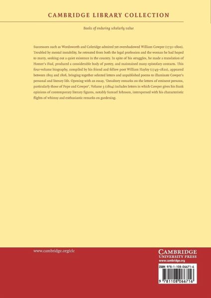 Successors such as Wordsworth and Coleridge admired yet overshadowed William Cowper (1731-1800). Troubled by mental instability, he retreated from both the legal profession and the woman he had hoped to marry, seeking out a quiet existence in the country. In spite of his struggles, he made a translation of Homer's Iliad, produced a considerable body of poetry, and maintained many epistolary contacts. This four-volume biography, compiled by his friend and fellow poet William Hayley (1745-1820), appeared between 1803 and 1806, bringing together selected letters and unpublished poems to illuminate Cowper's personal and literary life. Opening with an essay, 'Desultory remarks on the letters of eminent persons, particularly those of Pope and Cowper', Volume 3 (1804) includes letters in which Cowper gives his frank opinions of contemporary literary figures, notably Samuel Johnson, interspersed with his characteristic flights of whimsy and enthusiastic remarks on gardening.