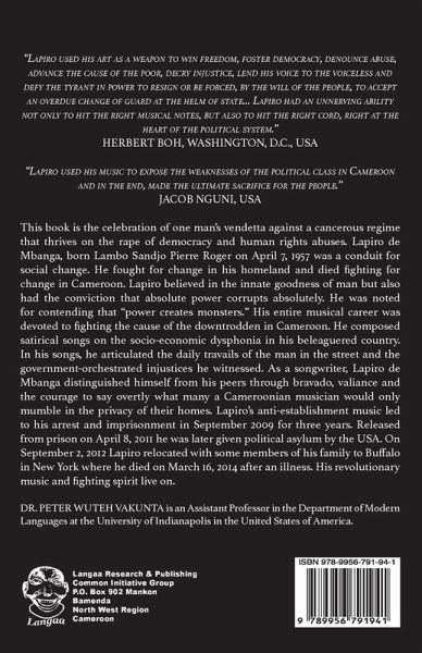 This book is the celebration of one man's vendetta against a cancerous regime that thrives on the rape of democracy and human rights abuses. Lapiro de Mbanga, born Lambo Sandjo Pierre Roger on April 7, 1957 was a conduit for social change. He fought for change in his homeland and died fighting for change in Cameroon. Lapiro believed in the innate goodness of man but also had the conviction that absolute power corrupts absolutely. He was noted for contending that "power creates monsters." His entire musical career was devoted to fighting the cause of the downtrodden in Cameroon. He composed satirical songs on the socio-economic dysphonia in his beleaguered country. In his songs, he articulated the daily travails of the man in the street and the government-orchestrated injustices he witnessed. As a songwriter, Lapiro de Mbanga distinguished himself from his peers through bravado, valiance and the courage to say overtly what many a Cameroonian musician would only mumble in the privacy of their homes. Lapiro's anti-establishment music led to his arrest and imprisonment in September 2009 for three years. Released from prison on April 8, 2011 he was later given political asylum by the USA. On September 2, 2012 Lapiro relocated with some members of his family to Buffalo in New York where he died on March 16, 2014 after an illness. His revolutionary music and fighting spirit live on.