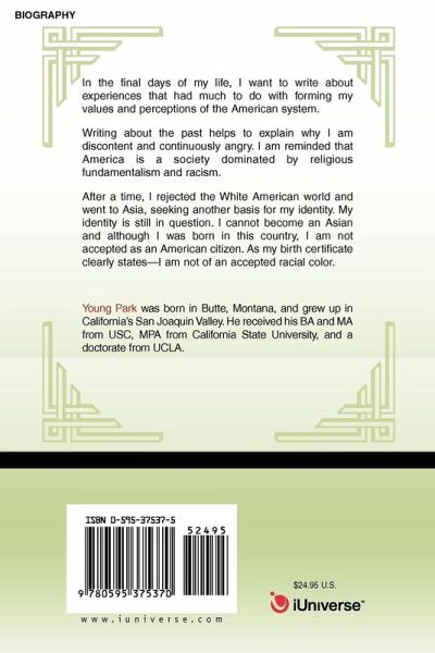Writing about the past helps to explain why I am discontent and continuously angry. I am reminded that America is a society dominated by religious fundamentalism and racism. After a time, I rejected the White American world and went to Asia, seeking another basis for my identity. My identity is still in question. I cannot become an Asian and although I was born in this country, I am not accepted as an American citizen. As my birth certificate clearly states - I am not of an accepted racial color.