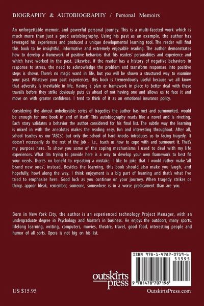 An unforgettable memoir, and powerful personal journey. More than just a good autobiography. Crises include early death of parents, dealing with major illnesses, loss of children and more. Using his past as an example, the author has produced a unique developmental learning tool the reader will find insightful, effective and even funny, to better deal with adversity. As the author puts it: I've led a pretty full and unusual life, which you may find interesting, relevant and helpful vis-a-vis your own situation. I've experienced numerous twists and turns, ongoing jolts - both up and down - and lots of learning. You may not agree with all my conclusions, but you'll be hard pressed to classify this book as dull. Many of my recommendations you will have heard already. This stuff isn't rocket science - just my attempt to forge an effective learning tool. A valid point is a valid point, even if not wholly new. Hopefully, some of them will be new for you. Ok, so how to deliver value by writing about one's life? When I say 'deliver value', one way to think of it is to better understand how you got to where you are today so you can use it as a point of departure going forward. Putting the details of your major life experiences on paper forces you to organize and examine the content critically, so as to decide what did/didn't work about a choice within the context of the whole experience. That's essentially the process I used to develop my recommendations. Naturally I've also bounced my ideas off others to determine whether and how our opinions compared. Where we aligned, we aligned. Where we didn't, it became obvious they were space aliens (only kidding). As for the presentation of the material, I'm authoring it anonymously to retain privacy for all concerned.