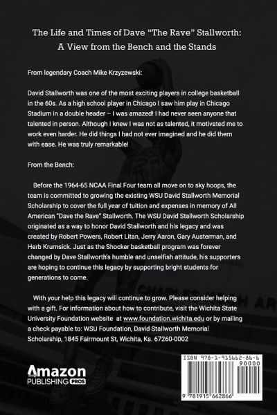 From legendary Coach Mike Krzyzewski: David Stallworth was one of the most exciting players in college basketball in the 60s. As a high school player in Chicago I saw him play in Chicago Stadium in a double header - I was amazed! I had never seen anyone that talented in person. Although I knew I was not as talented, it motivated me to work even harder. He did things I had not ever imagined and he did them with ease. He was truly remarkable! From the Bench: Before the 1964-65 NCAA Final Four team all move on to sky hoops, the team is committed to growing the existing WSU David Stallworth Memorial Scholarship to cover the full year of tuition and expenses in memory of All American "Dave the Rave" Stallworth. The WSU David Stallworth Scholarship originated as a way to honor David Stallworth and his legacy and was created by Robert Powers, Robert Litan, Jerry Aaron, Gary Austerman, and Herb Krumsick. Just as the Shocker basketball program was forever was forever changed by Dave Stallworth's humble and unselfish attitude, his supporters are hoping to continue this legacy by supporting bright students for generations to come.