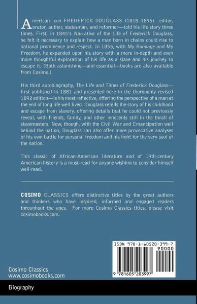 I have neither been miserable because of the ill-feeling of those about me, nor indifferent to popular approval, and I think, upon the whole, I have passed a tolerably cheerful and even joyful life. I have never felt myself isolated since I entered the field to plead the cause of the slave, and demand equal rights for all. In every town and city where it has been my lot to speak, there have been raised up for me friends of both colors to cheer and strengthen me in my work. I have always felt, too, that I had on my side all the invisible forces of the moral government of the universe. -from Chapter 17: "Incidents and Events" American icon FREDERICK DOUGLASS (1818-1895)-editor, orator, author, statesman, and reformer-told his life story three times. First, in 1845's Narrative of the Life of Frederick Douglass, he felt it necessary to explain how a man born in chains could rise to national prominence and respect. In 1855, with My Bondage and My Freedom, he expanded upon his story with a more in-depth and even more thoughtful exploration of his life as a slave and his journey to escape it. (Both astonishing-and essential-books are also available from Cosimo.) His third autobiography, The Life and Times of Frederick Douglass-first published in 1881 and presented here in the thoroughly revised 1892 edition-is his most reflective, offering the perspective of a man at the end of long life well lived. Douglass retells the story of his childhood and escape from slavery, offering details that he could not previously reveal, with friends, family, and other innocents still in the thrall of slavemasters. Now, though, with the Civil War and Emancipation well behind the nation, Douglass can also offer more provocative analyses of his own battle for personal freedom and his fight for the very soul of the nation. This classic of African-American literature and of 19th-century American history is a must-read for anyone wishing to consider himself well-read.