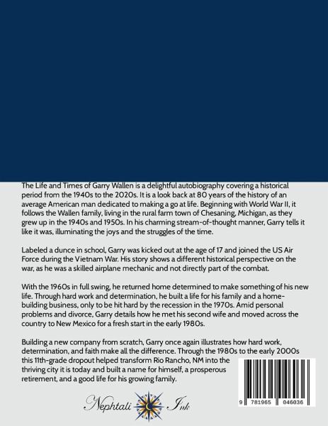 The Life and Times of Garry Wallen is a delightful autobiography covering a historical period from the 1940s to the 2020s. It is a look back at 80 years of the history of an average American man dedicated to making a go at life. Beginning with World War II, it follows the Wallen family, living in the rural farm town of Chesaning, Michigan, as they grew up in the 1940s and 1950s. In his charming stream-of-thought manner, Garry tells it like it was, illuminating the joys and the struggles of the time. Labeled a dunce in school, Garry was kicked out at the age of 17 and joined the US Air Force during the Vietnam War. His story shows a different historical perspective on the war, as he was a skilled airplane mechanic and not directly part of the combat. With the 1960s in full swing, he returned home determined to make something of his new life. Through hard work and determination, he built a life for his family and a home-building business, only to be hit hard by the recession in the 1970s. Amid personal problems and divorce, Garry details how he met his second wife and moved across the country to New Mexico for a fresh start in the early 1980s. Building a new company from scratch, Garry once again illustrates how hard work, determination, and faith make all the difference. Through the 1980s to the early 2000s this 11th-grade dropout helped transform Rio Rancho, NM into the thriving city it is today and built a name for himself, a prosperous retirement, and a good life for his growing family.