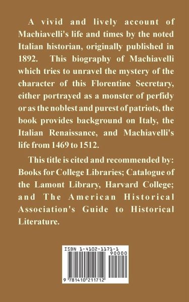 A vivid and lively account of Machiavelli's life and times by the noted Italian historian, originally published in 1892. This biography of Machiavelli which tries to unravel the mystery of the character of this Florentine Secretary, either portrayed as a monster of perfidy or as the noblest and purest of patriots, the book provides background on Italy, the Italian Renaissance, and Machiavelli's life from 1469 to 1512. This title is cited and recommended by: Books for College Libraries; Catalogue of the Lamont Library, Harvard College; and The American Historical Association's Guide to Historical Literature.