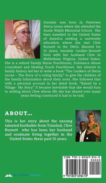 Imodale was born in Freetown Sierra Leone where she attended the Annie Walsh Memorial School. She then travelled to the United States of America seeking a university education where she met Clive Burnett in the 1960s. Married for 55 years, Imodale Caulker- Burnett lives with her husband Clive in Midlothian Virginia, United States. She is a retired Family Nurse Practitioner, Substance Abuse Consultant and Healing Touch Practitioner. Her interest in family history led her to write a book "The Caulkers of Sierra Leone - The Story of a ruling family," to give the children of the family information about their roots. She followed that with a personal account in her latest book, "Raised by a Village- My Story." It became inevitable that she would turn to writing about Clive whose life she has shared over many years feeling convinced it had to be told. This is her story about the unsung talented footballer from Trinidad, Clive Burnett who has been her husband and soulmate living together in the United States these past 55 years.